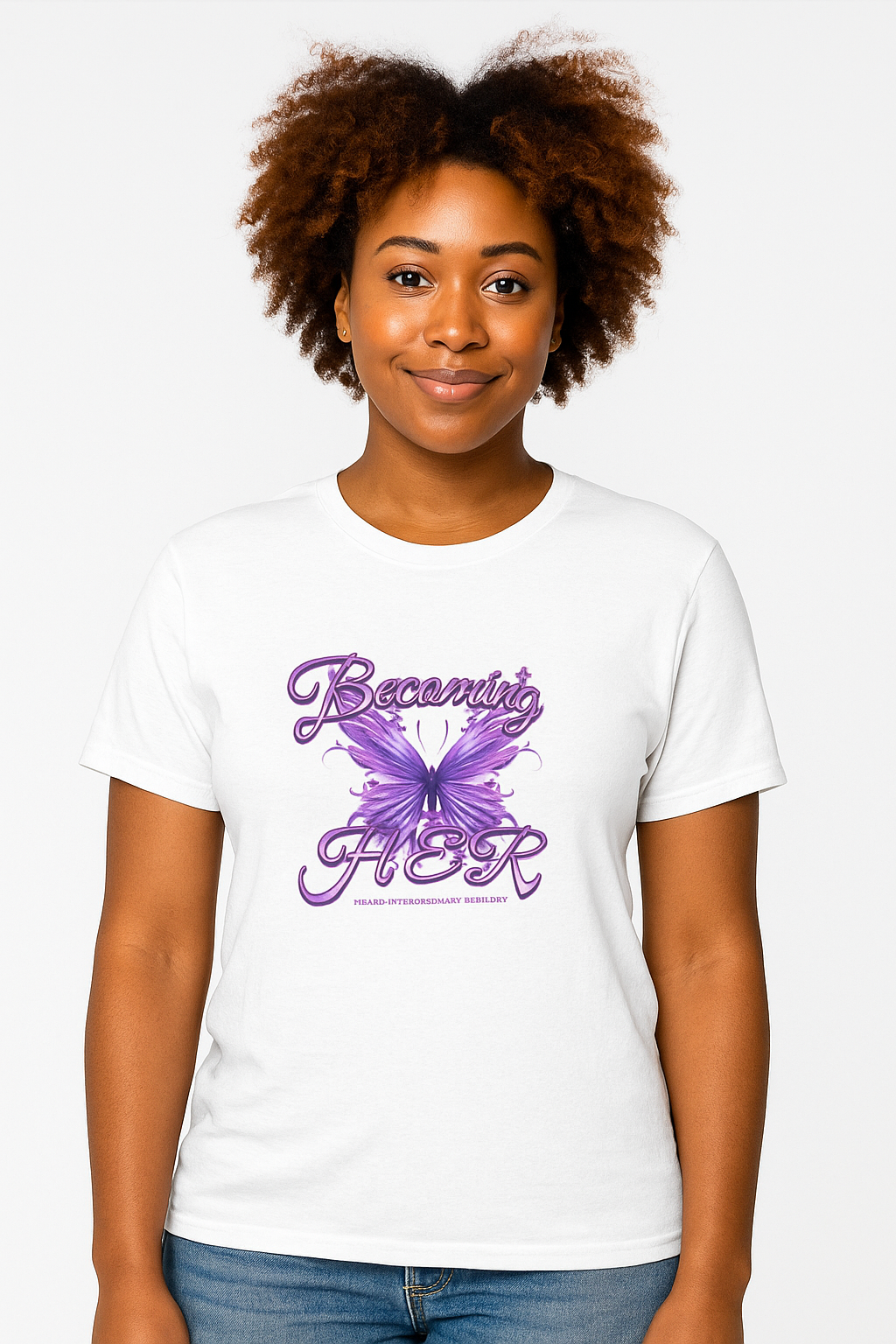 Wings were always part of the plan. The "Transformation" edition of our Becoming Her Tee showcases a stunning, oversized purple butterfly — the ultimate symbol of growth, freedom, and rebirth. Paired with the words Healed. Extraordinary. Resilient., this design honors the beauty of becoming the version of yourself you were always meant to be.